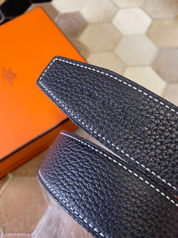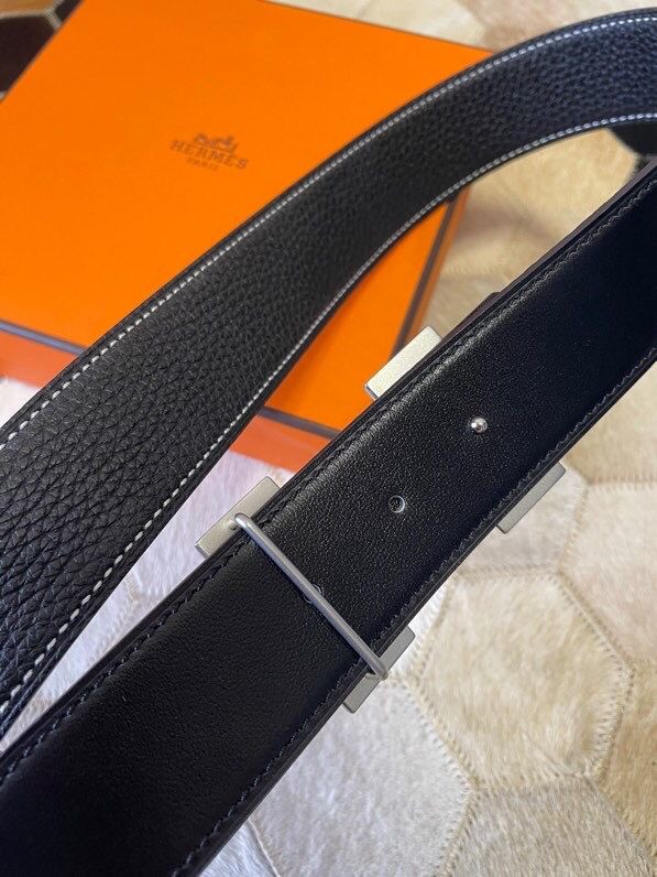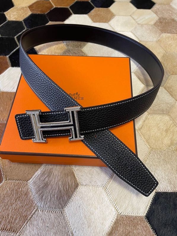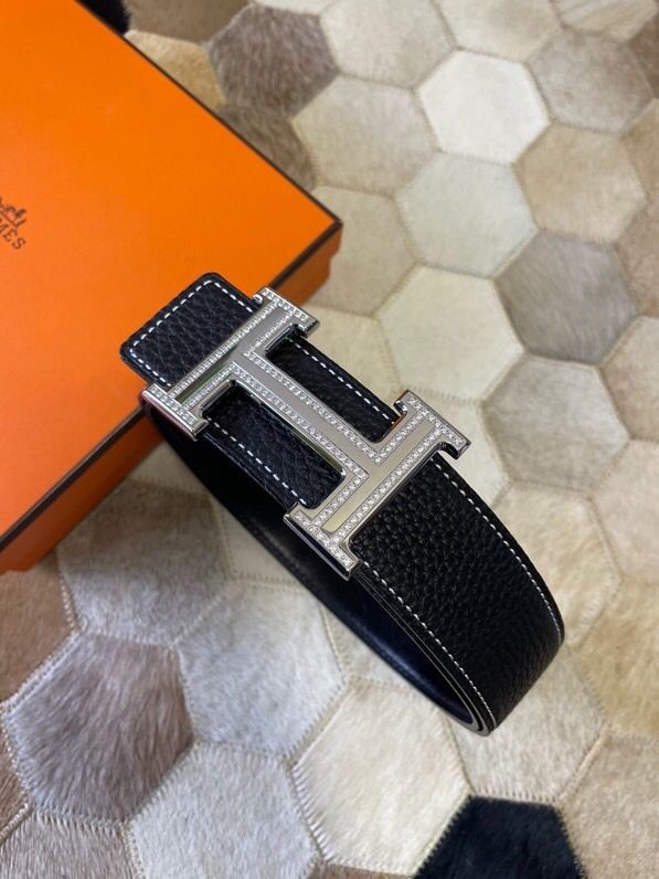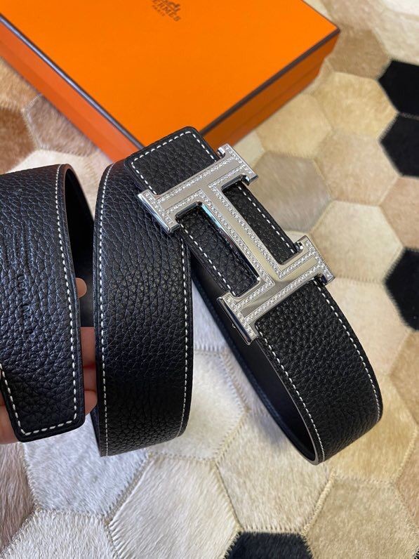 Hermes Stainless Steel Double Row Rhinestone Hanging Buckle Reversible Leather Men s 3.8cm Belt
