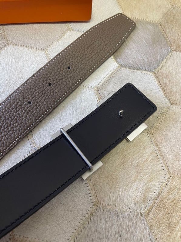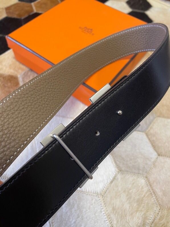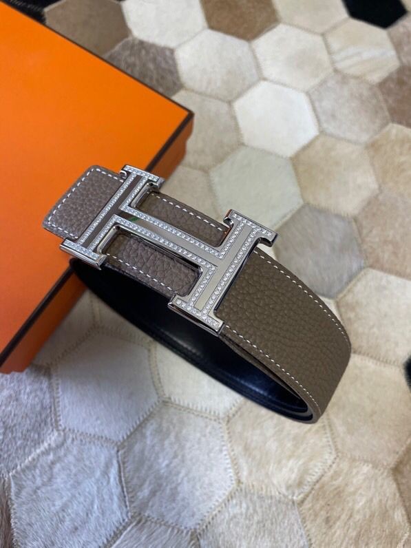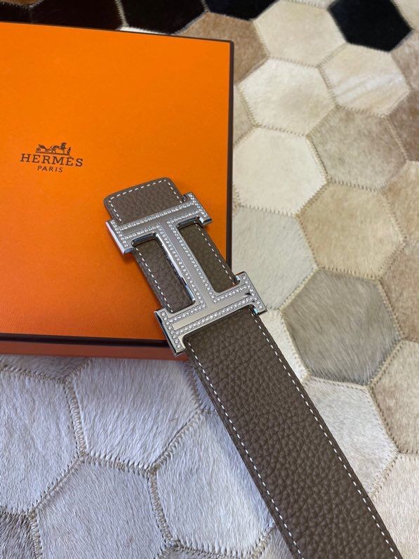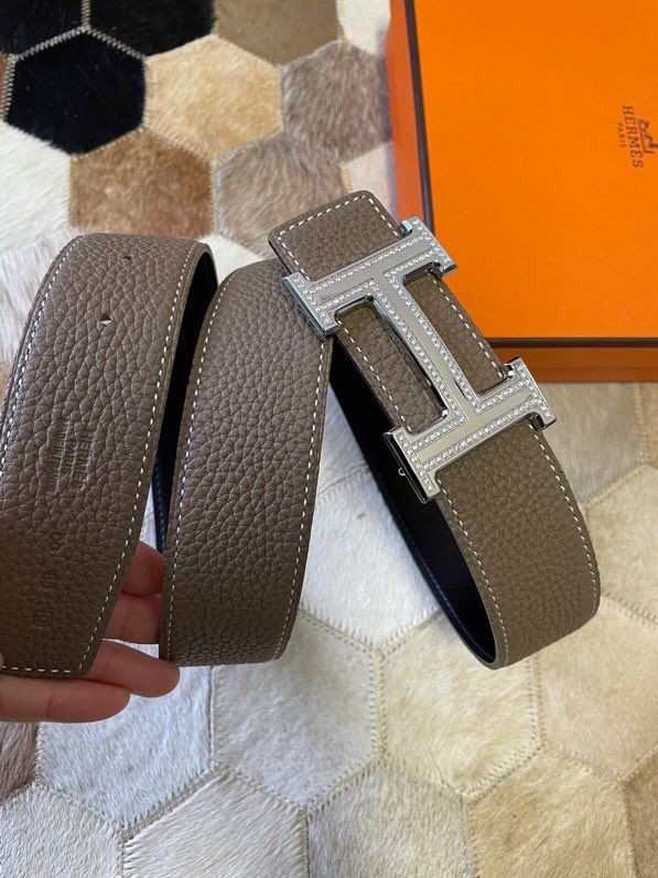 Hermes Stainless Steel Double Row Rhinestone Hanging Buckle Reversible Leather Men s 3.8cm Belt