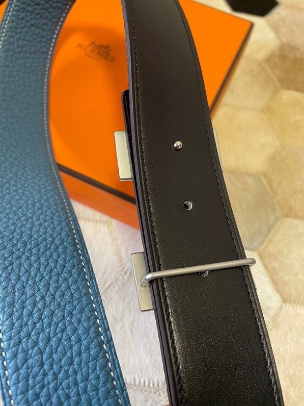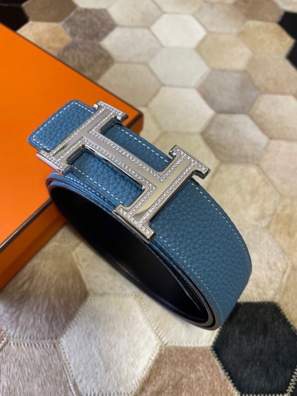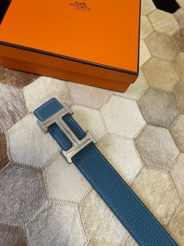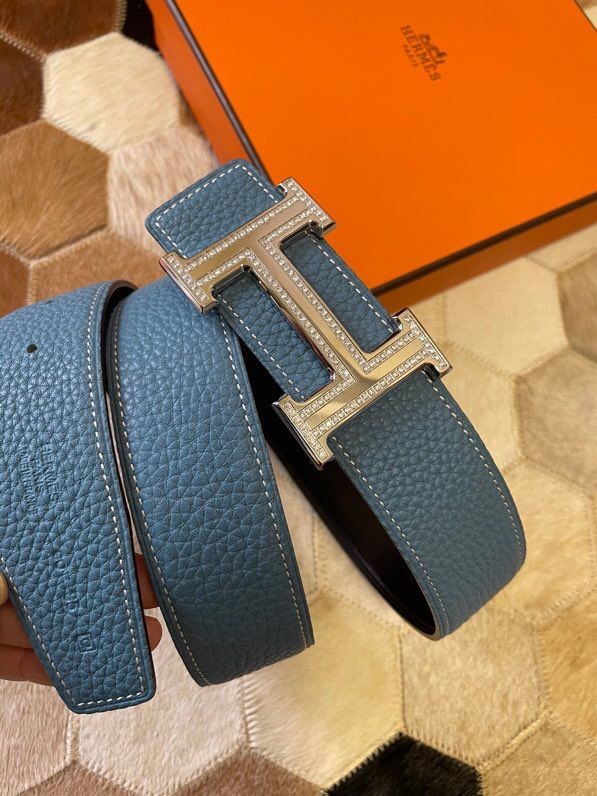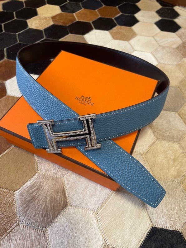 Hermes Stainless Steel Double Row Rhinestone Hanging Buckle Reversible Leather Men s 3.8cm Belt