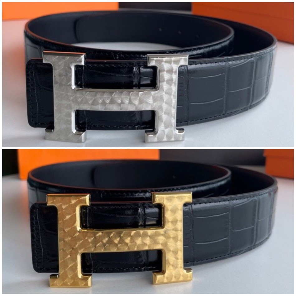 Hermes stainless steel H pattern metal buckle cowhide embossed crocodile pattern 38mm belt