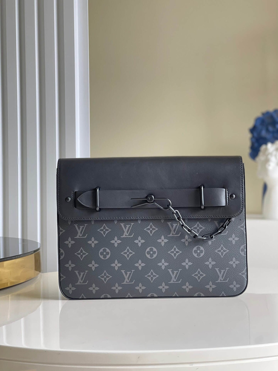 Pochette Steamer handbag Monogram Eclipse canvas classic shape black metal chain