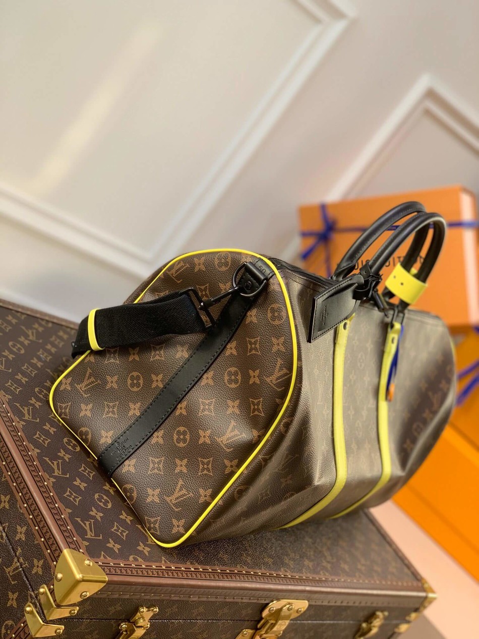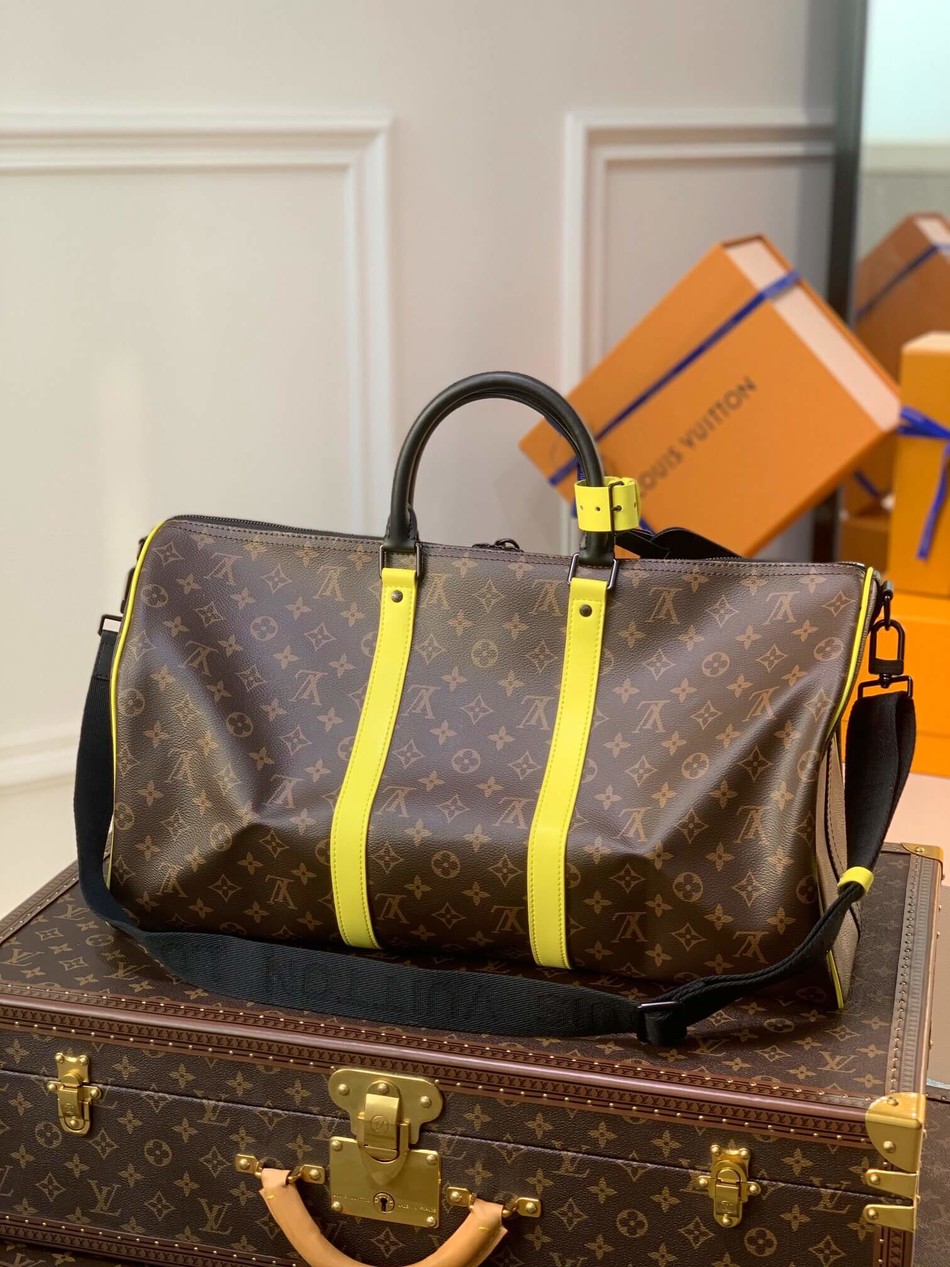 The classic Keepall Bandoulière 50 in Monogram Macassar canvas is livened up with touches of florescent yellow, notably on the lateral leather bands and top handle fastener. The removable and adjustable strap and rolled leather top handles enable comfortable carry. The Keepall 50 is the perfect size for short trips.