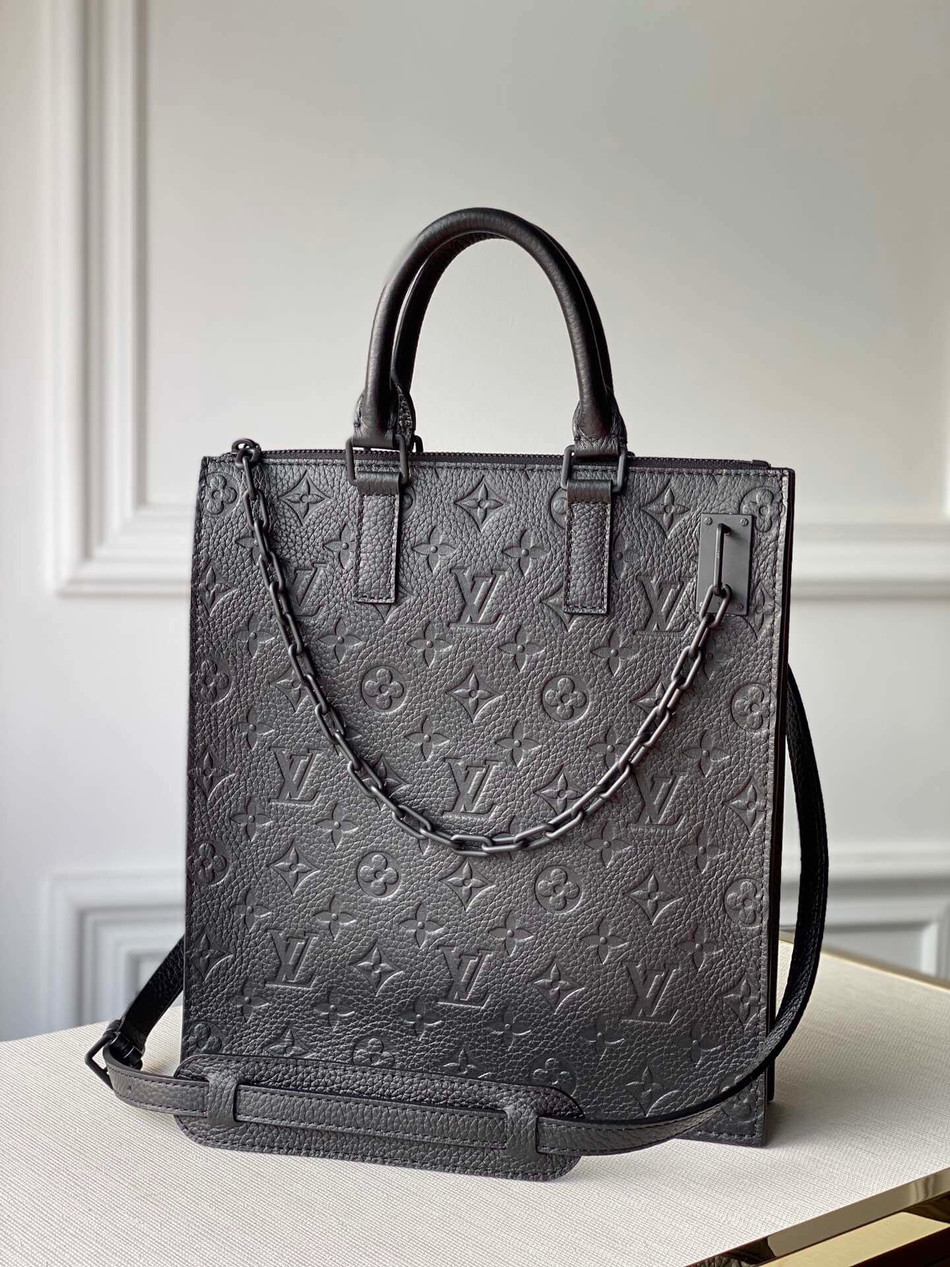 Inspired by Louis Vuitton s Sac Plat bag from 1968, Virgil Abloh plays with proportions to create the Sac Plat Messenger, a stylishly slim yet highly practical men s carryall bag. This messenger is made from black Monogram embossed Taurillon leather and features Abloh s signature chain. The adjustable strap allows crossbody and shoulder carry.