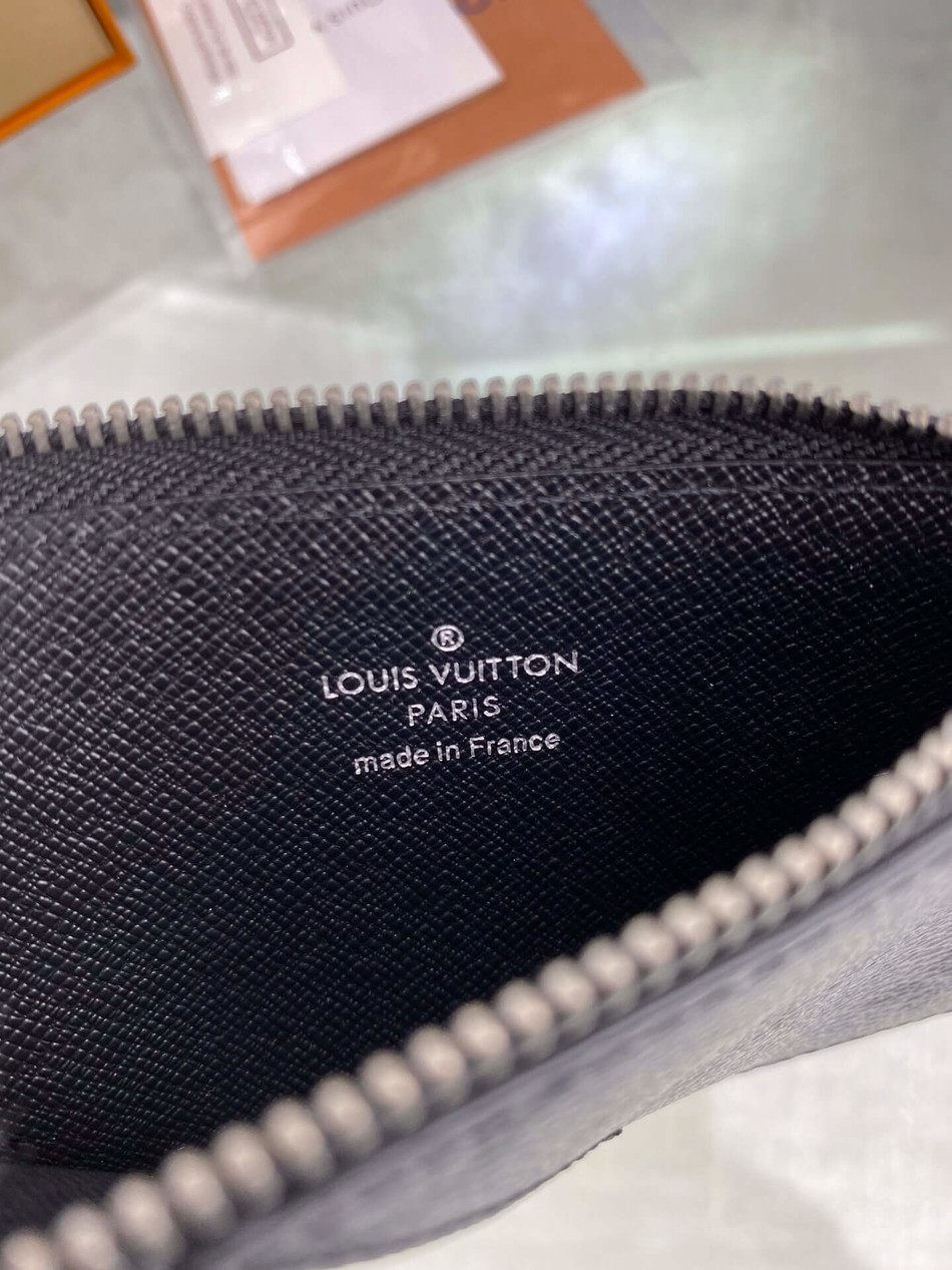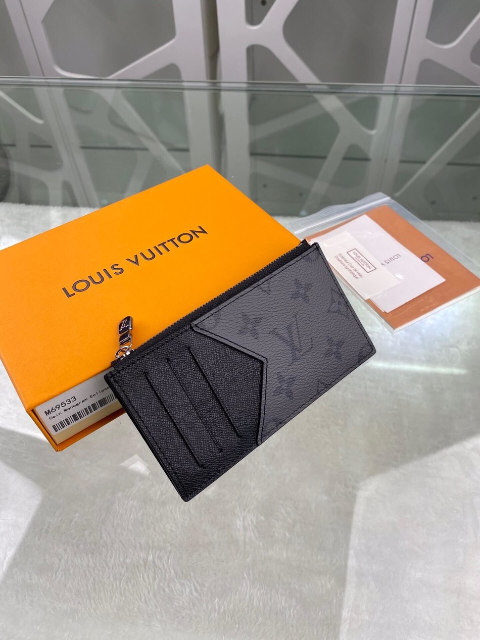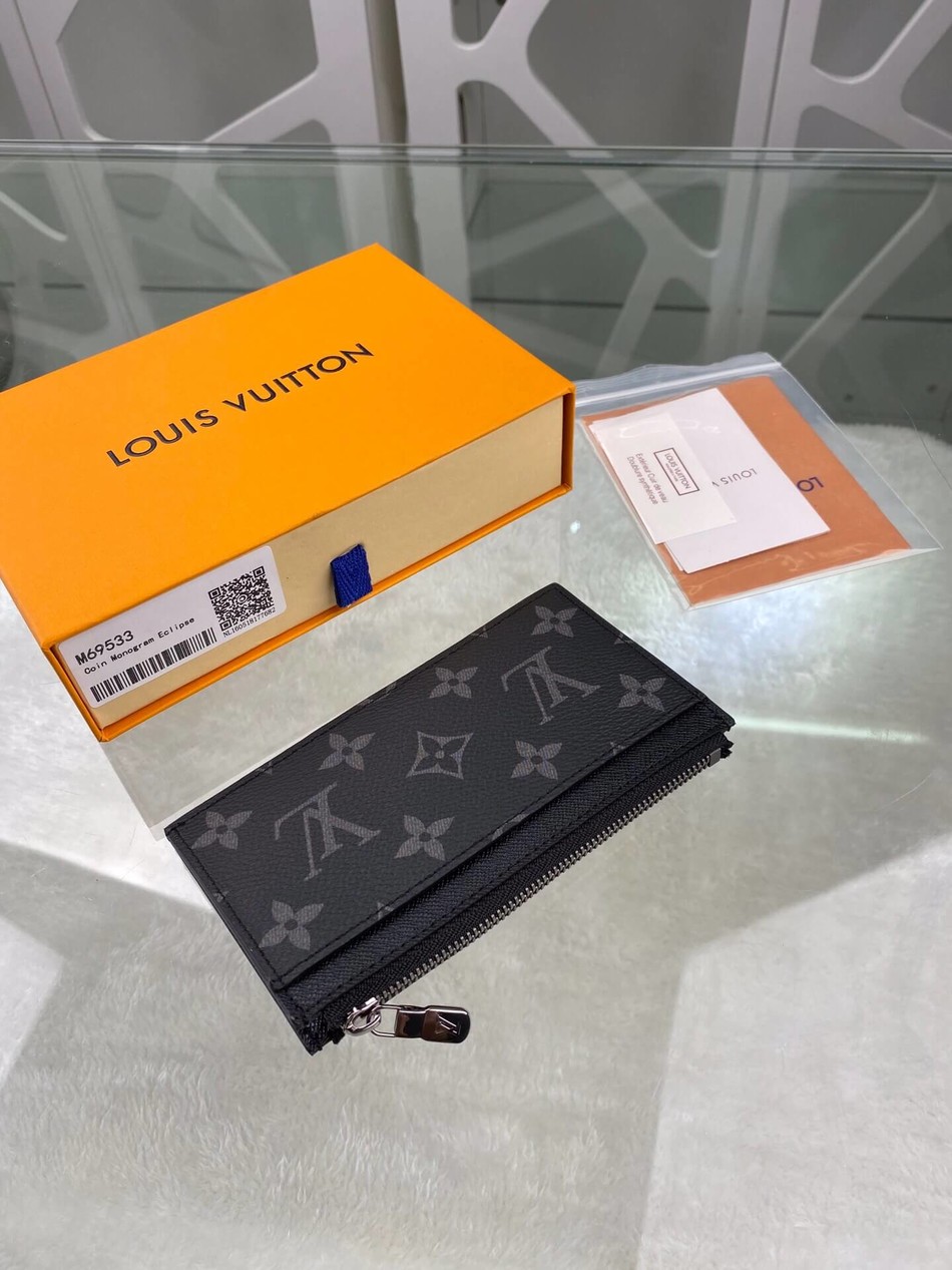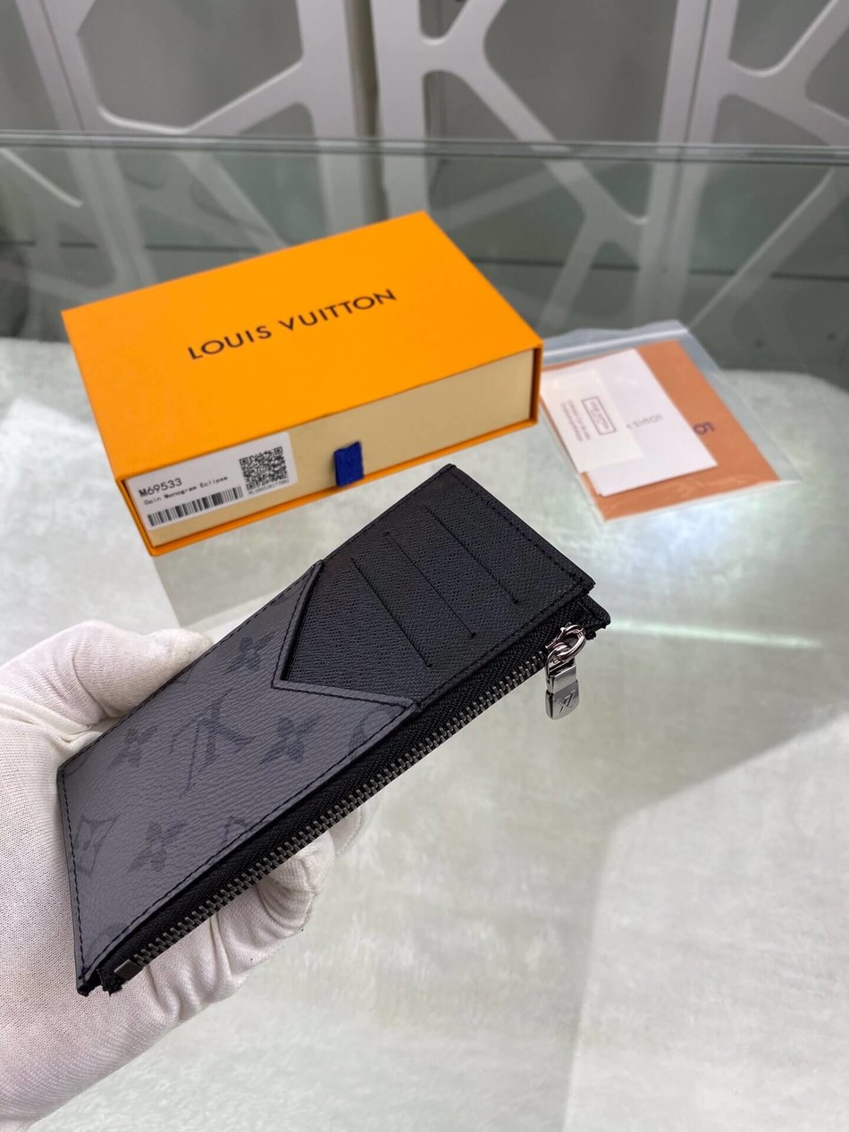 M69533 Coin card holder with coated canvas and Monogram Eclipse Reverse coated canvas zipper coin pocket and bill compartment, with LV letter zipper pull. Size: 8.0 x 14.5 x 1.0 cm